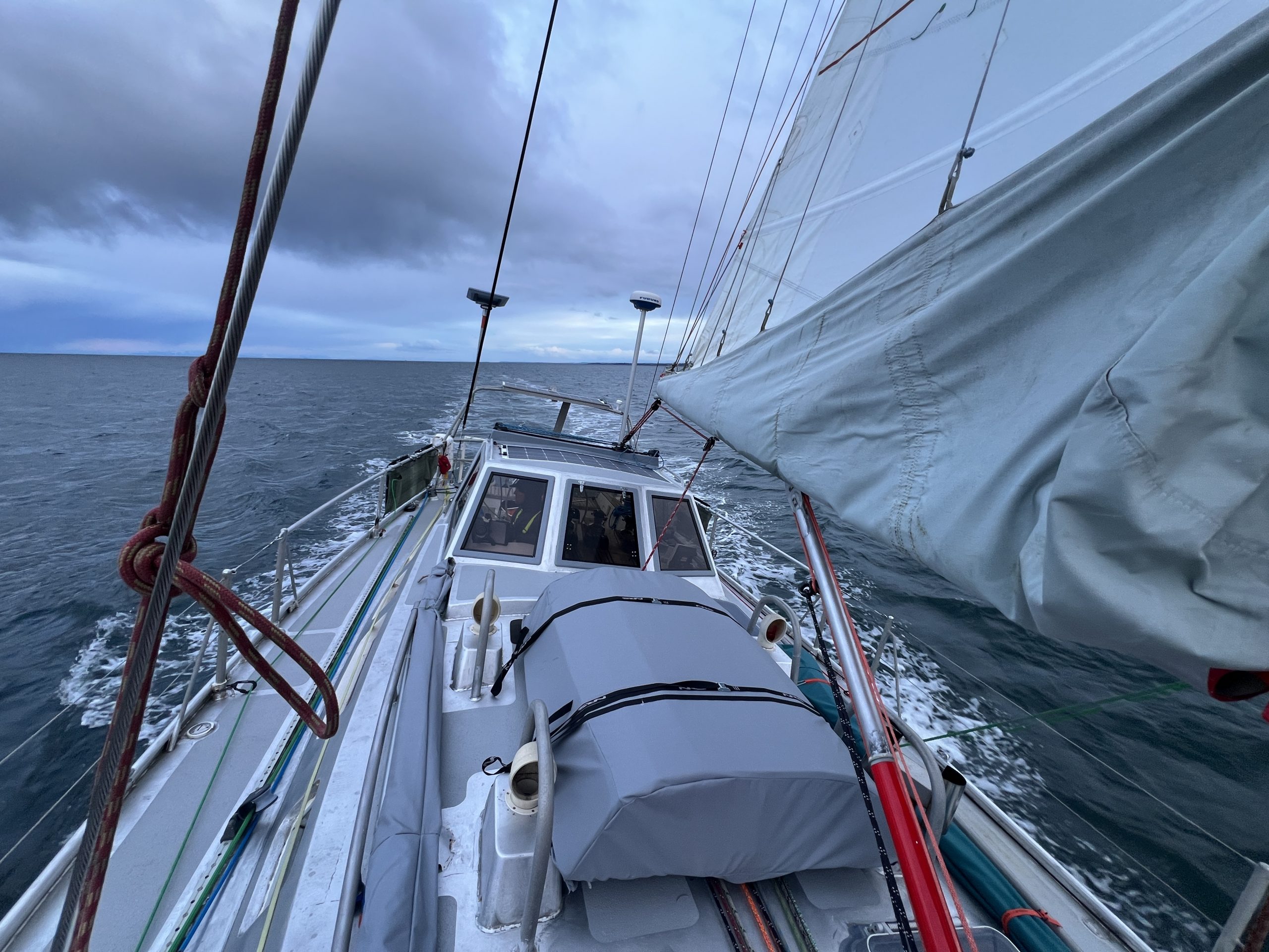 With a good weather forecast we took the “lets go as far as we can” approach. We waved to friends in Port Townsend as we motored past on the last of the ebb and I took a zoom call as we we close reached in 15kts of cold breeze past Port Angeles with a setting sun over the Olympics.